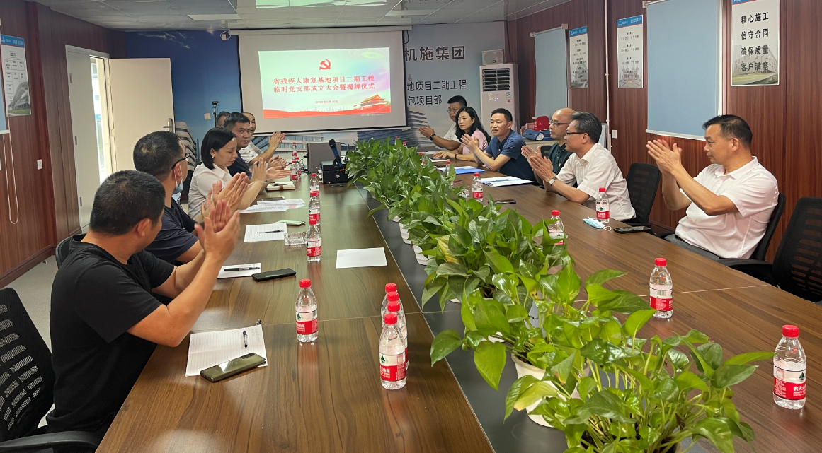2022年6月30日上午,在迎接中國共產(chǎn)黨成立101周年之際,省殘疾人康復(fù)基地二期工程舉行臨時黨支部成立大會暨揭牌儀式。省殘疾人聯(lián)合會黨組成員機關(guān)黨委書記、副理事長陳宏宇,二級主任科員基建負(fù)責(zé)人阮德貴,省代建局機關(guān)紀(jì)委書記史旺林,項目建設(shè)管理部副部長吳傳保,監(jiān)理單位副經(jīng)理朱伍元,機施集團副總經(jīng)理石琴琴及十一工程管理部總經(jīng)理梁慧文等出席了揭牌儀式。
