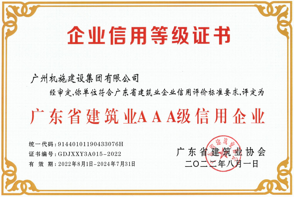 近日,機(jī)施集團(tuán)獲評“2022年度廣東省建筑業(yè)AAA信用企業(yè)”。