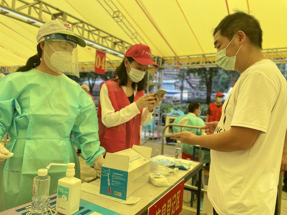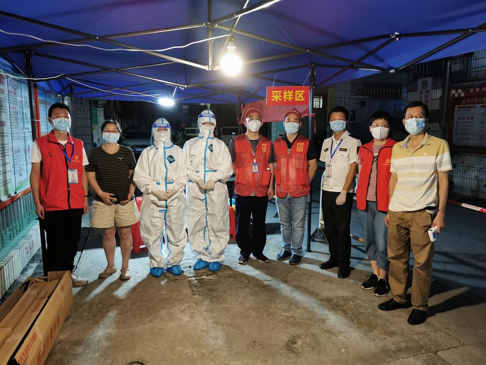 全體黨員及職工干部踴躍報(bào)名并組建三支志愿者隊(duì),全天支持現(xiàn)場(chǎng)(東港花園廣新路停車場(chǎng)、萬科黃埔倉)核酸檢測(cè)工作,主要負(fù)責(zé)掃樓督促居民核酸檢測(cè)、采集葵花碼信息、維持秩序、現(xiàn)場(chǎng)指引、解答疑問等工作。