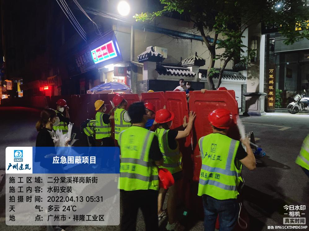 2022年4月12日晚,機(jī)施集團(tuán)接到白云區(qū)棠景街應(yīng)急圍蔽任務(wù)。公司應(yīng)急小組、各應(yīng)急小隊(duì)從廣州各地向白云區(qū)集結(jié),工程部、安全部調(diào)度圍蔽資源、應(yīng)急物資等向任務(wù)地進(jìn)發(fā)。為確保任務(wù)高效完成,機(jī)施集團(tuán)迅速組織管理人員35人,工人125人,運(yùn)輸車(chē)2輛,水車(chē)2輛參加施工任務(wù)。4月13日凌晨起,各施工點(diǎn)快馬加鞭展開(kāi)作業(yè),經(jīng)過(guò)近8小時(shí)的通宵作戰(zhàn),共安裝水馬約2400個(gè),于早上7時(shí)完成約2.1公里的圍蔽施工任務(wù)。