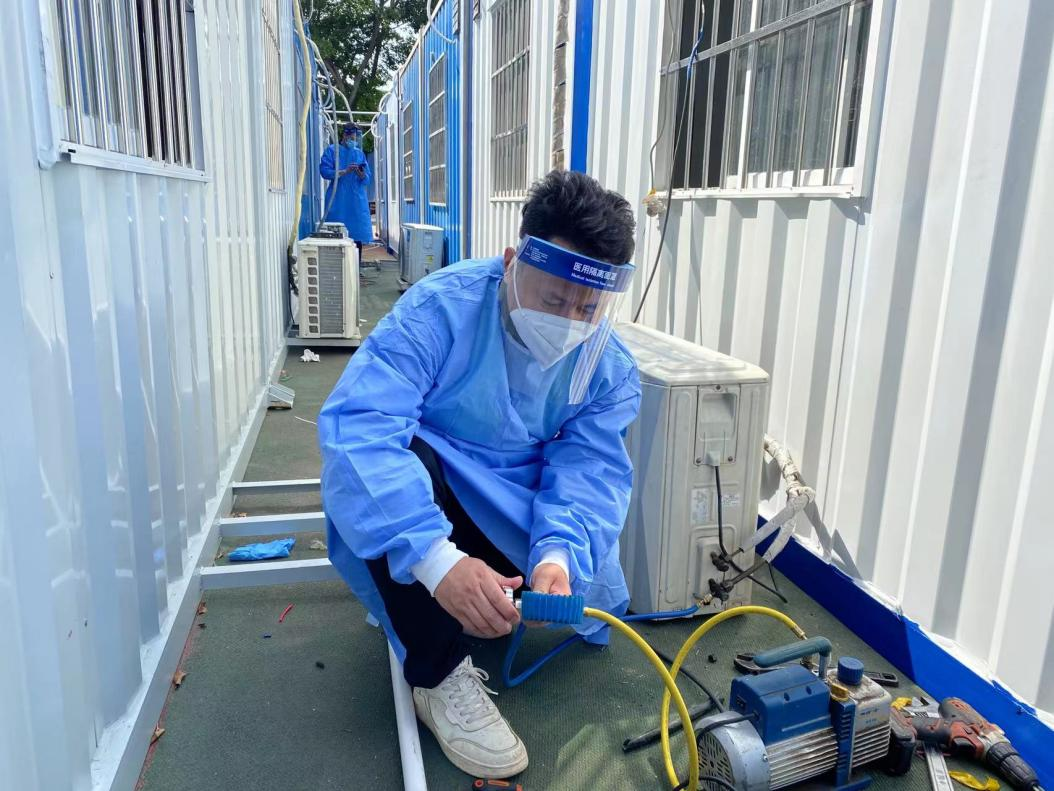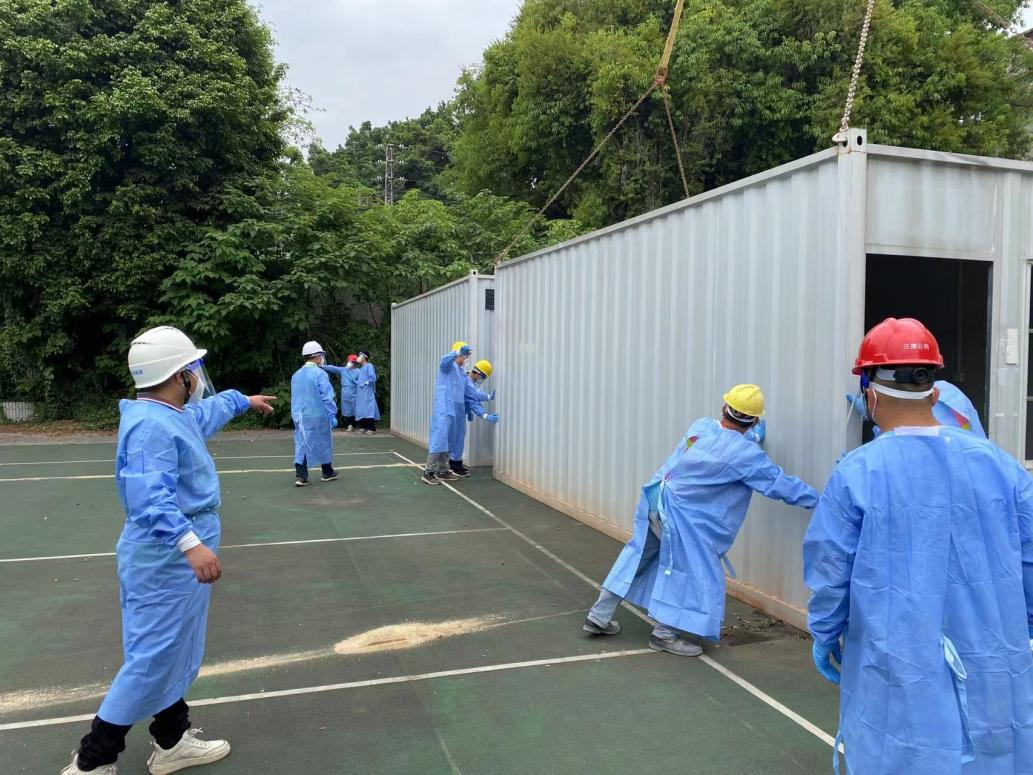 公司自接到白云區(qū)集裝箱安裝任務(wù)指令后,迅速組織人員和物資趕赴現(xiàn)場(chǎng)。第一批管理人員于2022年4月13日凌晨5:00達(dá)現(xiàn)場(chǎng)組織開(kāi)展場(chǎng)地平整工作,為后續(xù)工作創(chuàng)造有利條件。期間,公司積極對(duì)接街道及相關(guān)負(fù)責(zé)部門(mén),幾經(jīng)選址確定最終場(chǎng)地,并于下午1點(diǎn)開(kāi)展吊裝作業(yè)。10名管理人員和30名工人奮戰(zhàn)18小時(shí),完成36個(gè)集中箱吊裝、空調(diào)安裝、床鋪架設(shè)等主體建設(shè)。